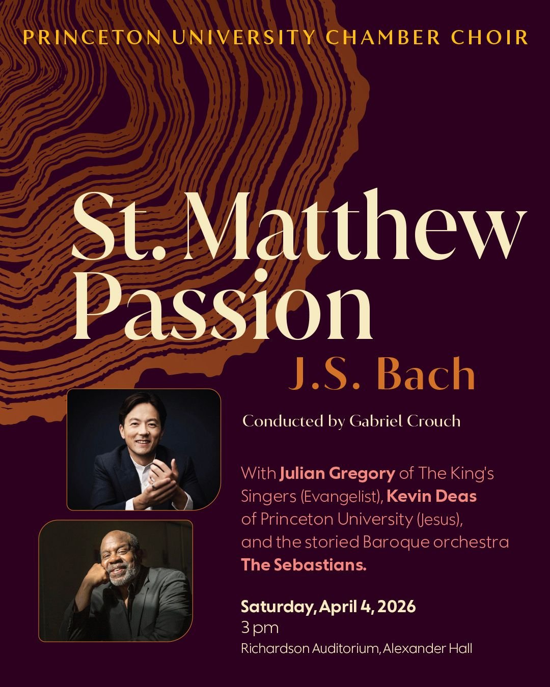 Join the PU Chamber Choir for an Easter performance of Bach’s most revered Oratorio. We are honored and excited to join forces with Julian Gregory of The King’s Singers (Evangelist), Kevin Deas of Princeton University (Jesus), and the storied Baroque orchestra The Sebastians. This is a concert not to be missed!